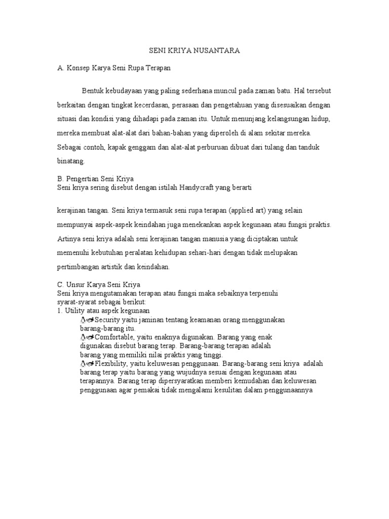 Artinya seni kriya adalah seni kerajinan tangan manusia yang diciptakan untuk memenuhi kebutuhan peralatan.